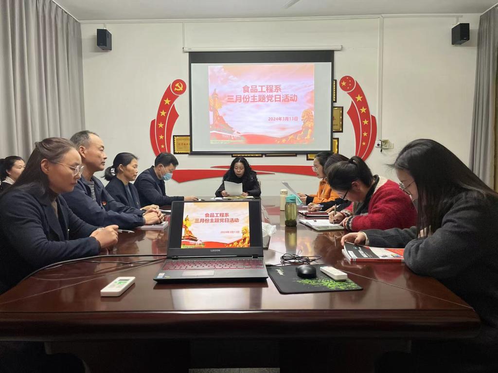 近日,食品工程系教工党支部在系党员活动室开展3月份主题党日活动,本次活动由食品工程系党总支负责人王新娜主持,全体党员教师参加了此次活动。