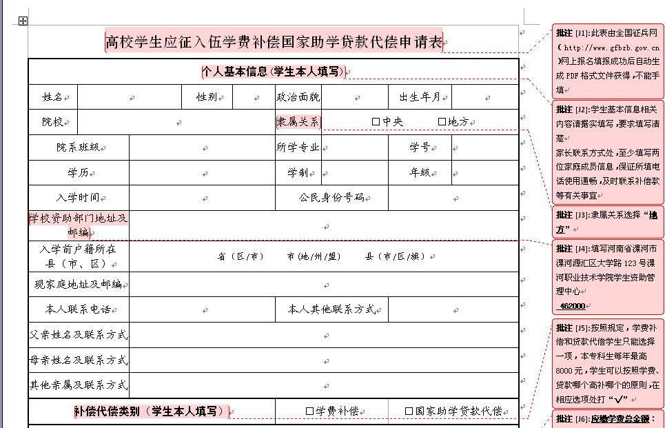 高校员工应征入伍学费补偿国家助学贷款代偿申请表填写注意事项